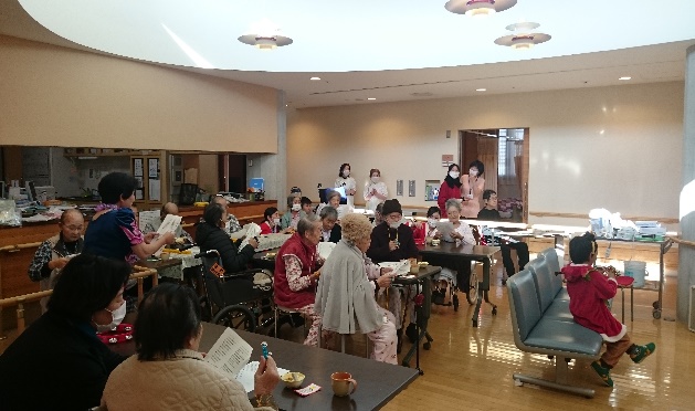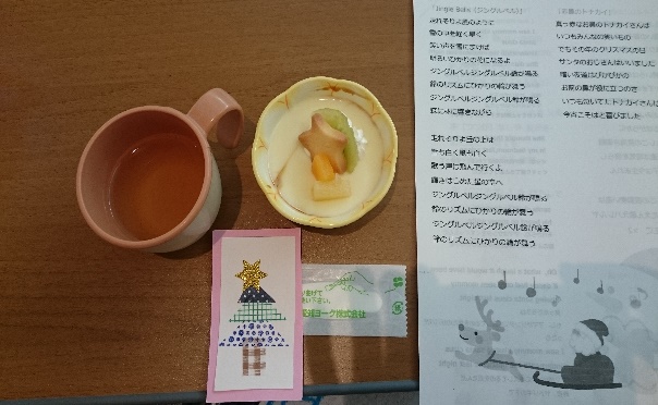 栄養科の方が手作りして用意してくださったクリスマスバージョンのデザートも好評で、久しぶりに甘いものを口にされ、食べて、歌って、鈴を鳴らして…と、皆さんとても素敵な笑顔でした。職員も患者様の素敵な表情に感激して一緒に楽しんでいました。