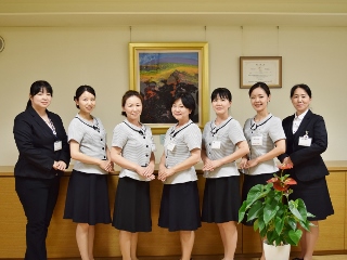 医事課は、爽やかなブルーに紺色のパイピングが施されスッキリとした印象の中、首元のリボンが華やかさを添えています。