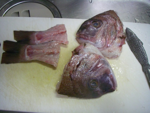 アラの下処理をチェック。ウロコ・汚れを落とし、熱湯をかけさっと洗う。