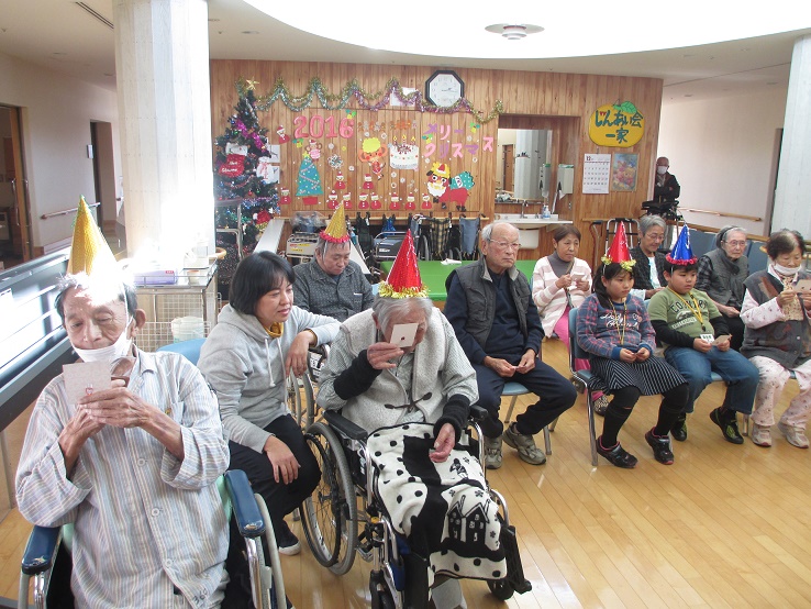 …しばらくすると「リーチ!」1〜2人の方の数字が並んだようです。その後チリンチリーン♪一人の患者様が、「ビンゴ!」と、ワクワクドキドキのゲームでした。次は、“ソーラン節体操”の歌に合わせて、参加者全員で体を動かし元気な声で「どっこいしょ〜」と、大変盛り上がりました。最後は、一番のお楽しみ “手作りのクリスマスケーキ”の登場。ツリー型のケーキがとてもかわいらしく美味しそうでした。栄養士さんと厨房の方々の心のこもったケーキを皆さん喜んで召し上がっていました。