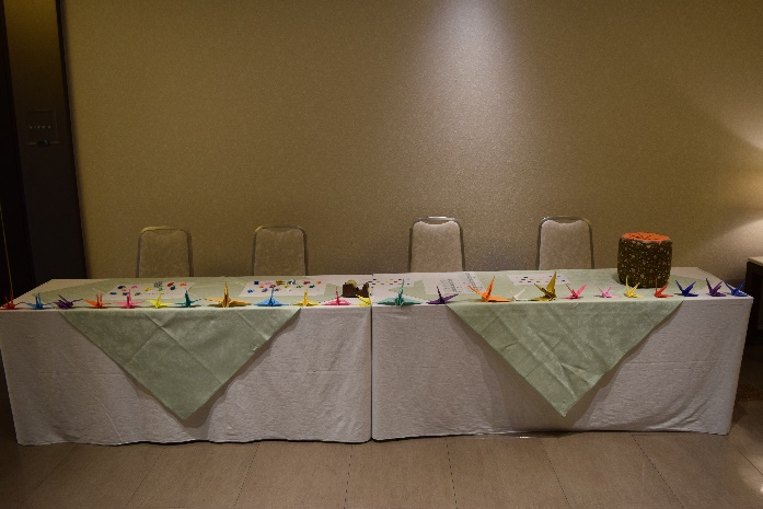 今年は、理事長が愛してやまない石原裕次郎さんの没後30年ということで、座席決めの代わりに色違いの折り鶴を運営メンバーで折りました。当日、受付で皆さんに引いてもらい、折り鶴の色で各テーブルに座っていただきました。
