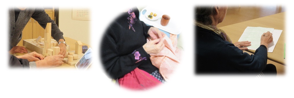 積み木でお城をつくるグループ、お手玉をかごから移す訓練をする方、裁縫をする方、塗り絵をする方などそれぞれの楽しみ方で過ごされています。
