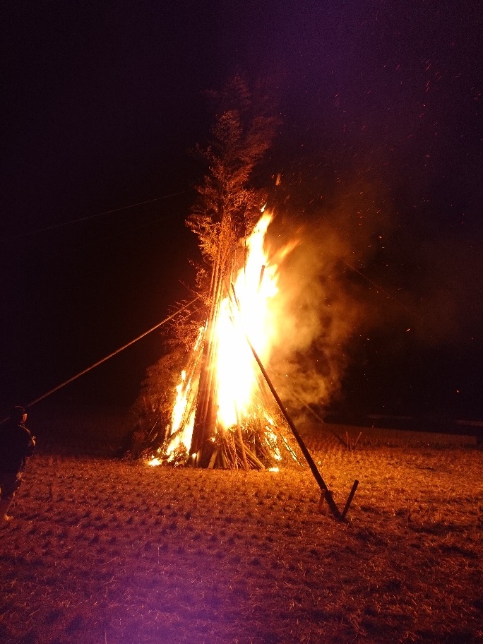 竹のはぜる音を聞き、火の粉を浴びながら無病息災を祈りました。