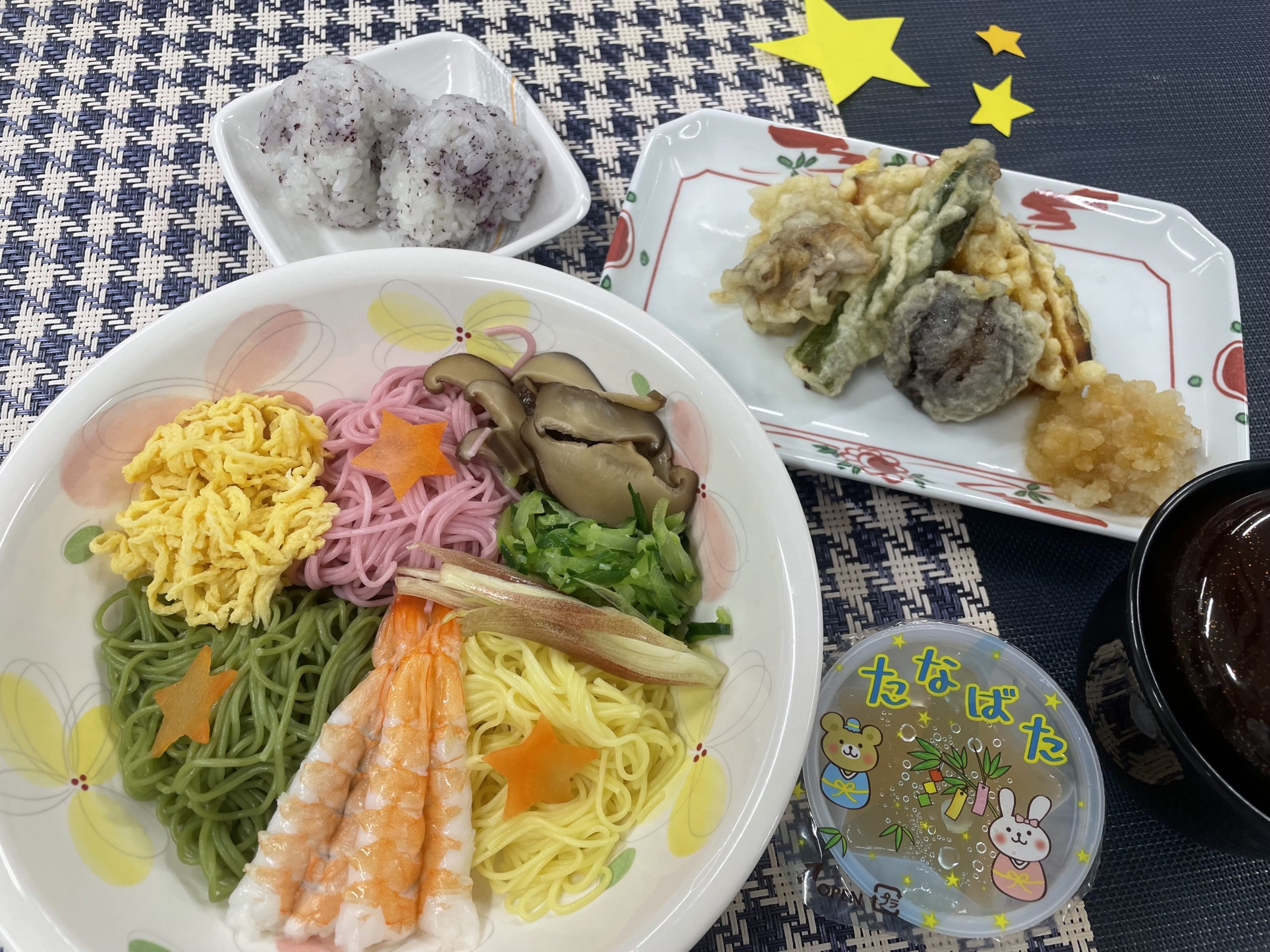 当院では色とりどりなそうめんに、海老・たまご・椎茸・胡瓜・みょうがを乗せた七夕そうめんを提供しました🎋