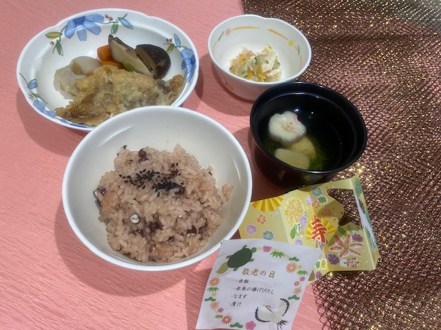 長い間社会の為に尽くしてきたご高齢の方々を敬い感謝の気持ちを込めて、本日は赤飯を提供しました。