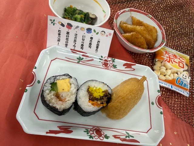 節分は、季節の変わり目に、悪いものを追い払って、幸せを呼び込む行事です。豆まきをして「鬼(邪気)」を払いますが、豆だと硬く食べられない患者様も多いので、豆の代わりに、形の似ているたまごボーロを提供しました(^^)今年は巻き寿司の1つをキンパ風にしてみました✨